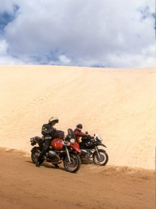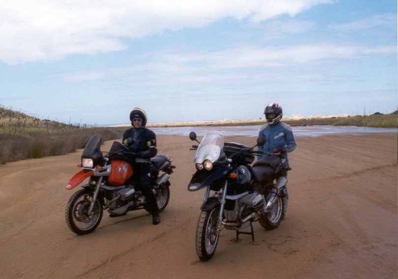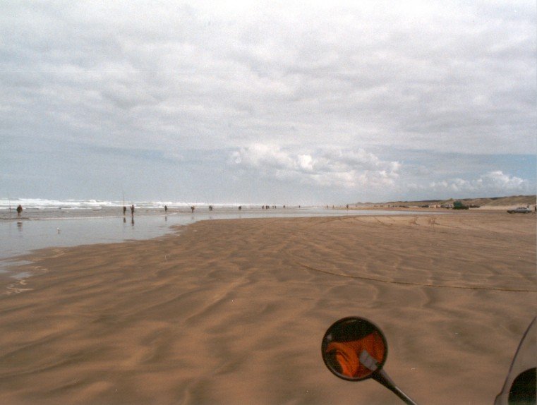 At first we were alone, riding on firm, smooth sand at up to 100 mph, but as we rode further north we found bumps and mushy sand. We saw 3 beached whales and hundreds of fishermen with long poles planted in the sand along the shore competing in a tournament.